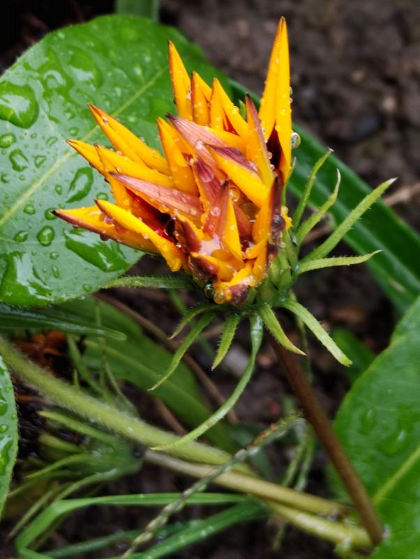 Kolem poledne jsem zavítal na zahrádku, která teď prožívá deštivou sezónu začínajícího podzimu. Vyfotil jsem kvetoucí gazánii, jež je orosena dešťovými kapkami.