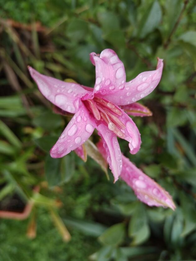 Bylo ponuro a deštivo, přesto jsem vyšel na zahrádku. Právě na mě čekala kvetoucí Nerine, kterou jsem vyfotil, též natočil její videogify, které jsem pak publikoval. Je nádherné, jak její růžová barva vyniká s kapkami deště.