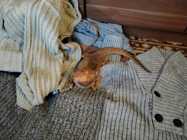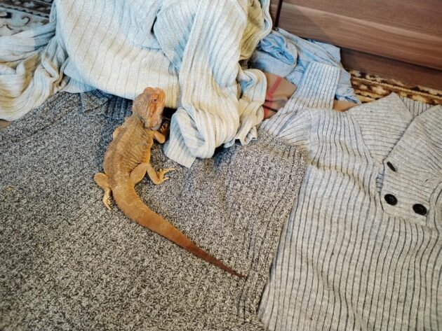 „Ze života mého ještěřího kamaráda, kterého jsem nechal proběhnout u nás doma v interiéru. Dneska to není na venčení Agiho. Agi si oblíbil bílý svetr a krabičku se strašilkami filipínskými, kterou očichal.“