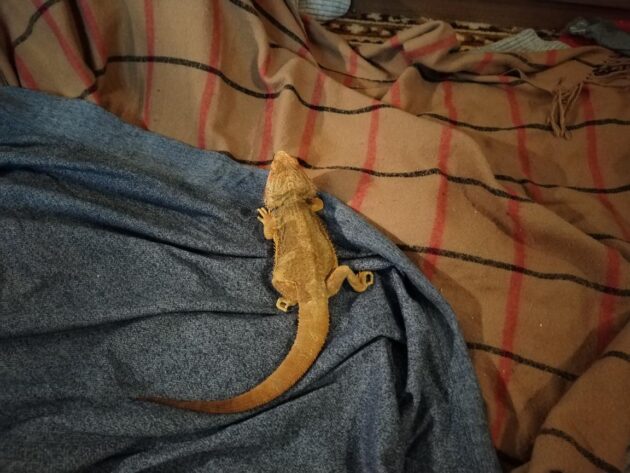 „Ze života mého ještěřího kamaráda, kterého jsem nechal včera proběhnout u nás doma v interiéru. Agi spíše relaxoval, díval se na mou postýlku.“