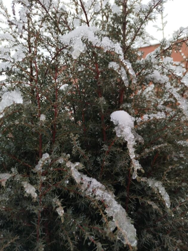 Ráno jsem spatřil sníh, který postupně taje, protože bylo dlouho teplo. Dokonce i chodník je skoro suchý. Na jalovcích obecných se tedy vyskytují ledové kompozice.
