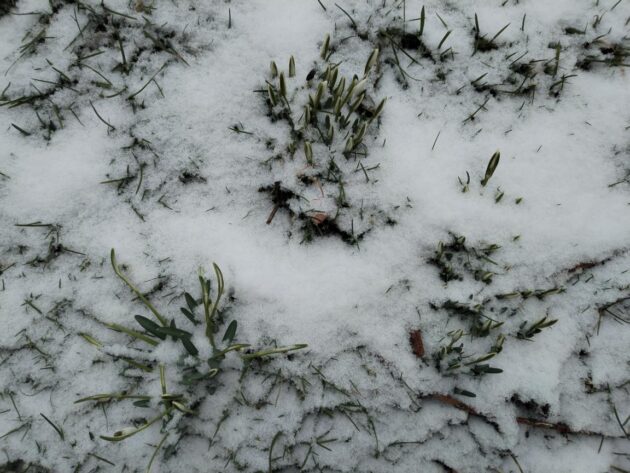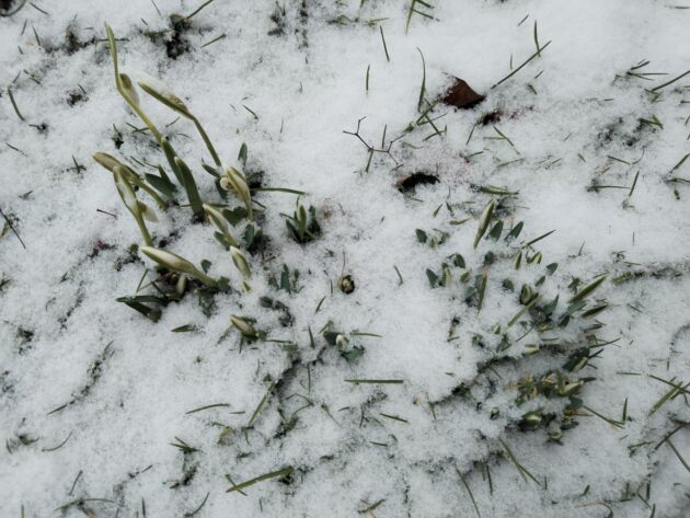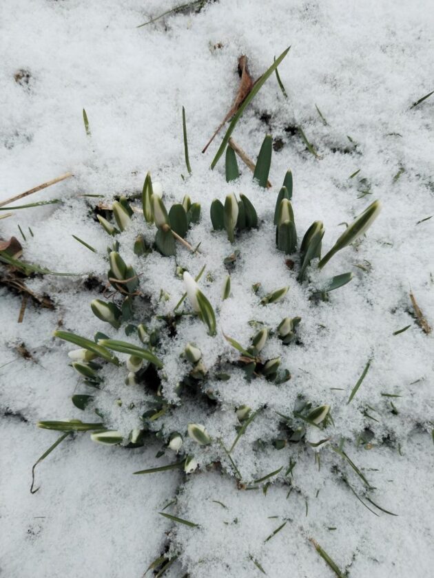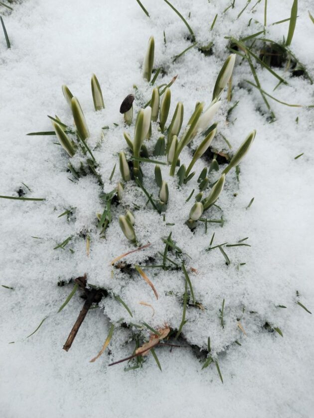 Na zahrádce jsem zhlédl kvetoucí sněženky a krokusy ve sněhu, jak se snaží žít.