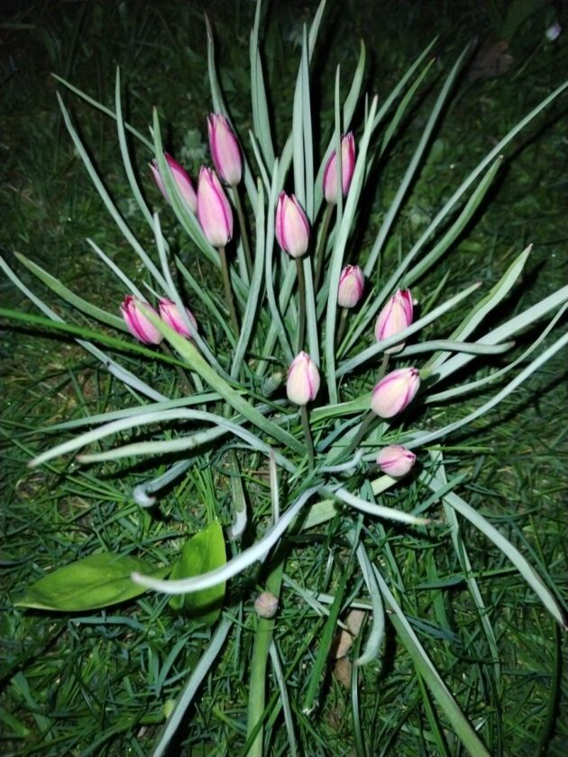 „Za chvíli“ vykvetou okrasné česneky. Také azalky budou v plném květu. Ještě mi nekvete azalka žlutá. Až odkvetou tulipány (Tulipa humilis var. Violacea), tak budu muset přes den posekat trávník na zahrádce.