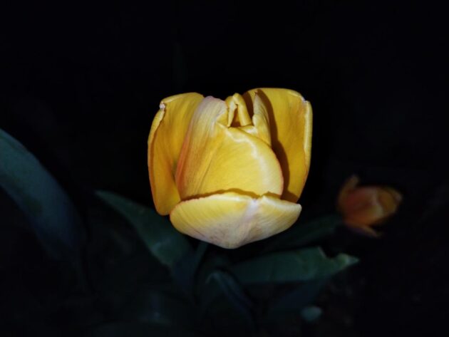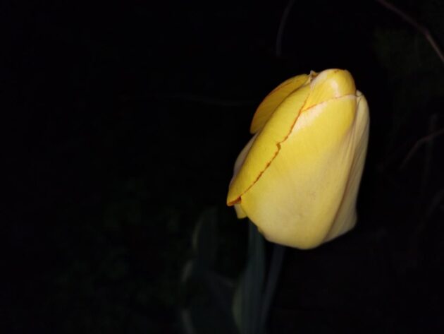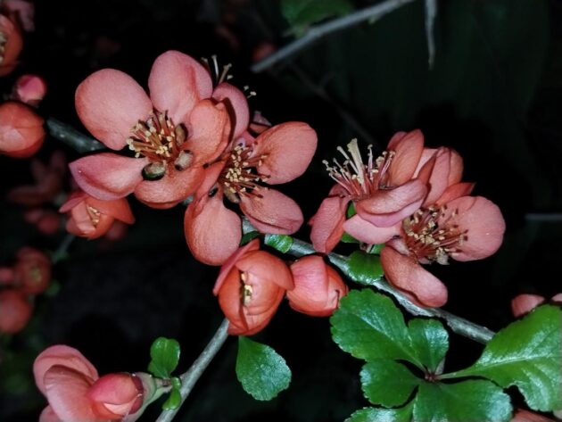 Kdoulovec japonský kvete v tajnosti. Azalka má svá poupata, která vynikají i v noční tmě za světla chytrého mobilu.