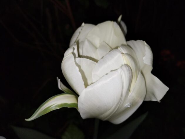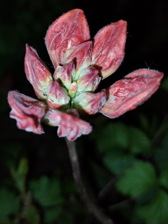 Jinak kultivar muchovníku olšolistého je ve fázi odkvétání. Začíná nasazovat na své plody. I v noci žiji květenou. Chtěl jsem ještě zdokumentovat rododendron, ale ten už jsem zdokumentoval za dne. V noci se mi totiž nepovedl snímek.